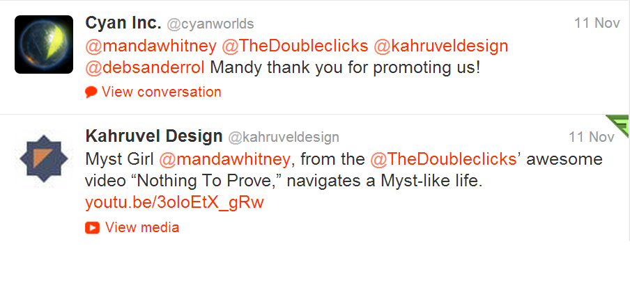 This video went viral. And someone watched it who also happened to be a Myst fanatic. And then that person took to Twitter, and let Cyan Worlds, the creators of Myst, know that there was a girl who mentioned Myst in this music video. Cyan asked if anyone knew who this girl was.
