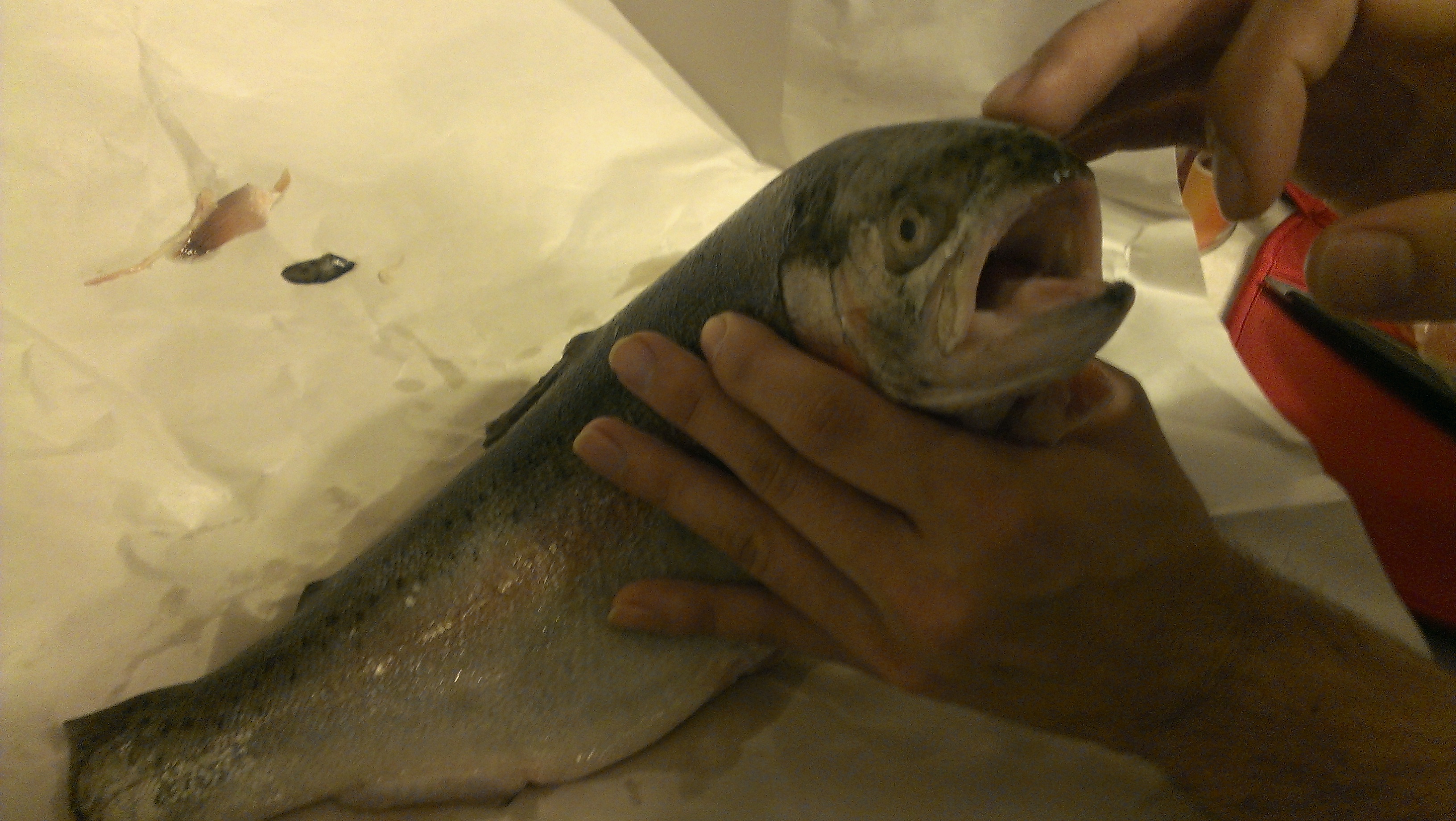 Pick your fish! I picked trout. Because salmon grosses me out. And instead of buying pricey fillets, we just bought a whole fish and paid half the price!