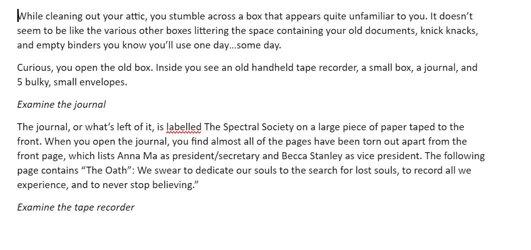 Luckily I have surrounded myself with honest and even often kind friends who will always take the time to hear me out and give me feedback. So I told a few of my friends of my idea, to feel out what they thought of it. I told them of the core of the story, following the relationship of two friends who start a ghost-hunting club and who run experiments to detect the paranormal. I tell them the general flow of where the story will go, what each puzzle will achieve, and how most of the narrative will be delivered through cassette tapes.