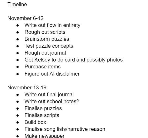 Before I get too far ahead of myself though, it’s time to actually write this stuff out. I try to write things out prose style but this time around things are still vague enough and there are so many details running through my head it’s not really working. So I opt to write out my very basic flow in point form to start so I can at least organize my thoughts. Since the narrative is largely being delivered through conversations on tape, the easiest thing to do is to organize the flow by those tapes. I started with point form…