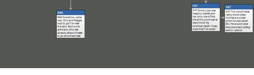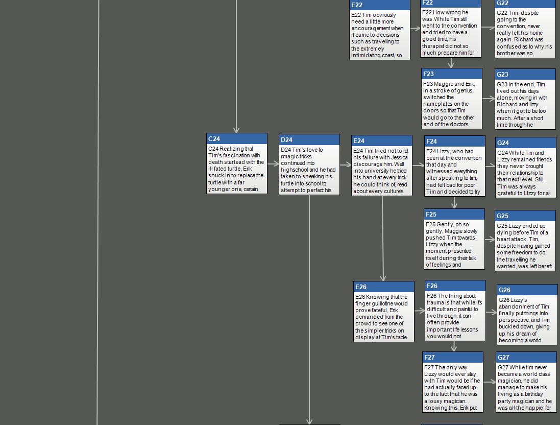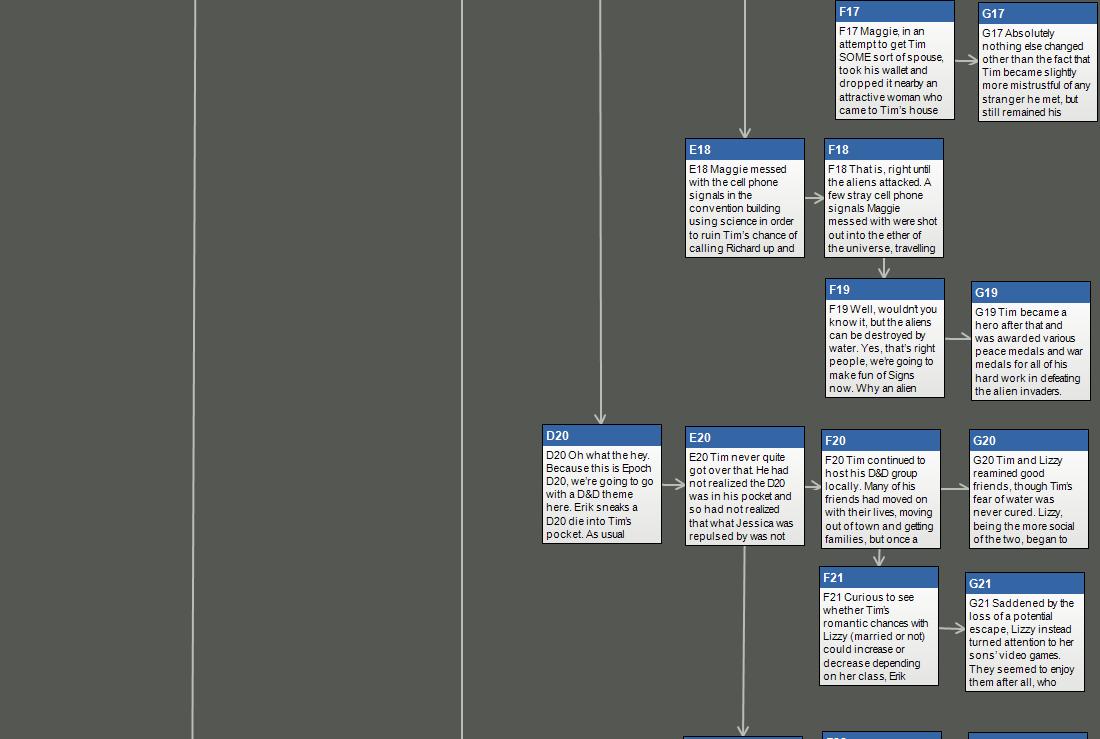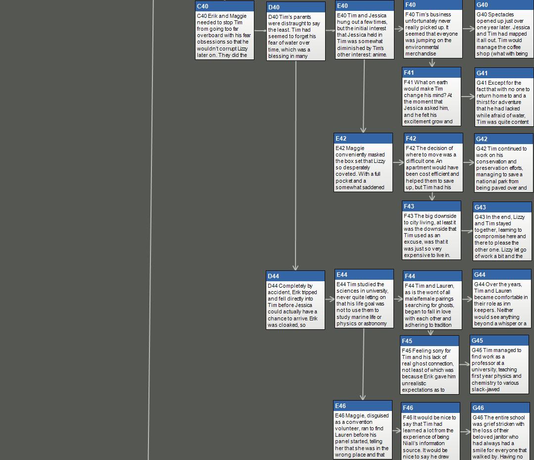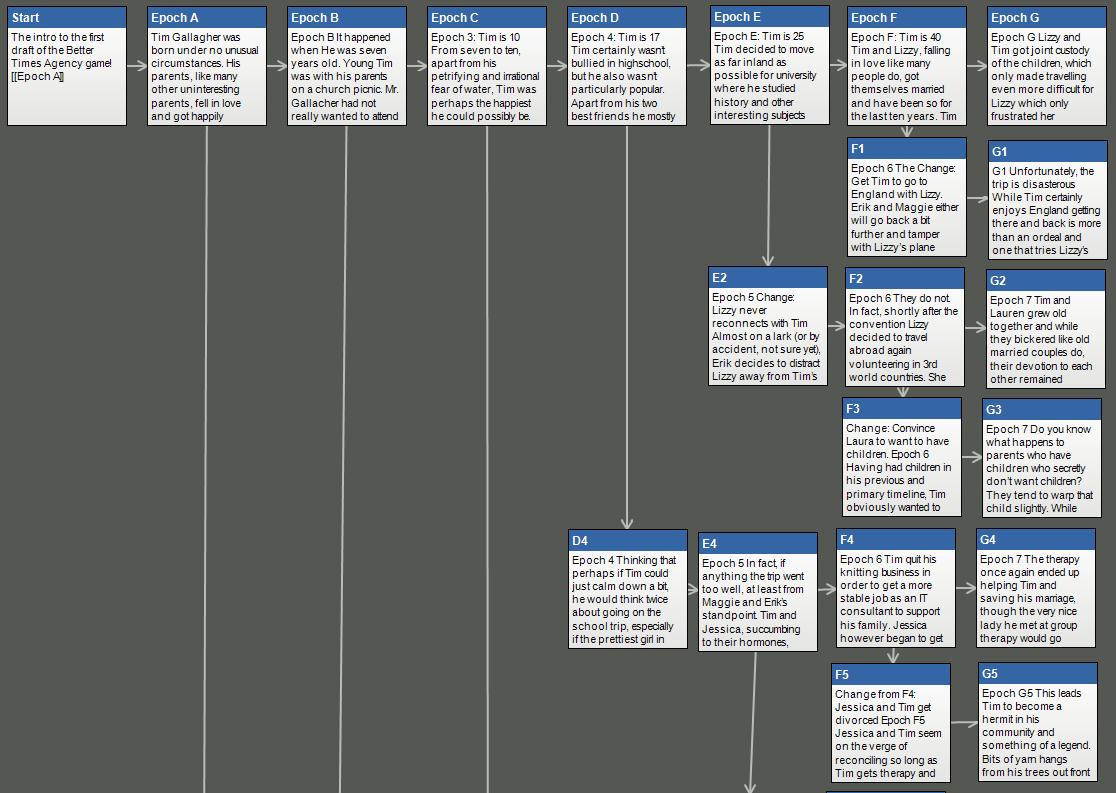 THIS is the chart I built in Twine for our time travel game. There are 47 different endings.
